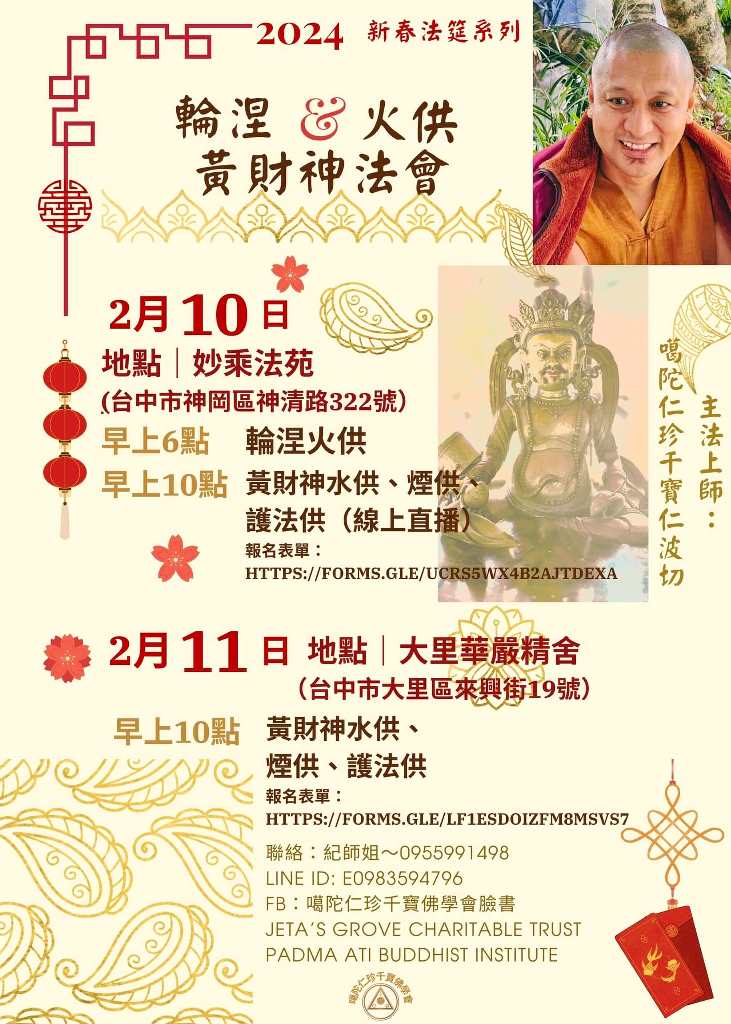 輪涅火供&黃財神水供 主法上師:寶上師仁珍千寶 寧瑪 火供 2024/02/10 尊貴仁珍千寶仁波切 2024/甲辰年迎春系列法筵! 主法上師:寶上師仁珍千寶 歡迎大家一起共襄盛舉! 2月10日(初一)早上10點 1. 6:00 AM 輪涅火供 2. 10:00 AM 黃財神水供(線上直播) 線上迎財神直播: zoom ID :860 456 7750 Password: 240203 細節請點入FB閱覽 https://www.facebook.com/share/p/5w4ipNLt3eVdfyAe/? 中華民國噶陀仁珍千寶佛學會 友善列印 上一篇:藥師佛超渡法會 下一篇:財神水供法會 精選法訊 台灣佛法顯密洲佛學會2025.11月法訊 2025/11/06~2025/11/30 寧瑪 灌頂 『大悲根除輪迴紅觀音』灌頂 2025/11/06~2025/11/09 寧瑪 灌頂 11/7-11/9頂髻尊勝佛母千供延壽 2025/11/07~2025/11/09 噶舉 法會 祭龍食子&龍煙供法會 2025/11/07 格魯 法會 11/7龍王日~龍供-祭龍食子暨百食子供 2025/11/07~2025/11/30 格魯 法會 秘密主金剛手&財寶天王會供賜資糧祈福大法 2025/11/07 寧瑪 法會 2026年【拍片實戰3月工作坊】開放報名 2025/11/07~2025/11/30 顯教 教學 2025年蓮師滿願塔‧博達佛塔─盛大供燈 2025/11/08~2025/11/11 薩迦 共修 喇嘛網| Facebook 全球慈悲智慧數位佛學院 全球藏傳佛教最新弘法訊息﹝ Google全球第一資訊同步 ﹞