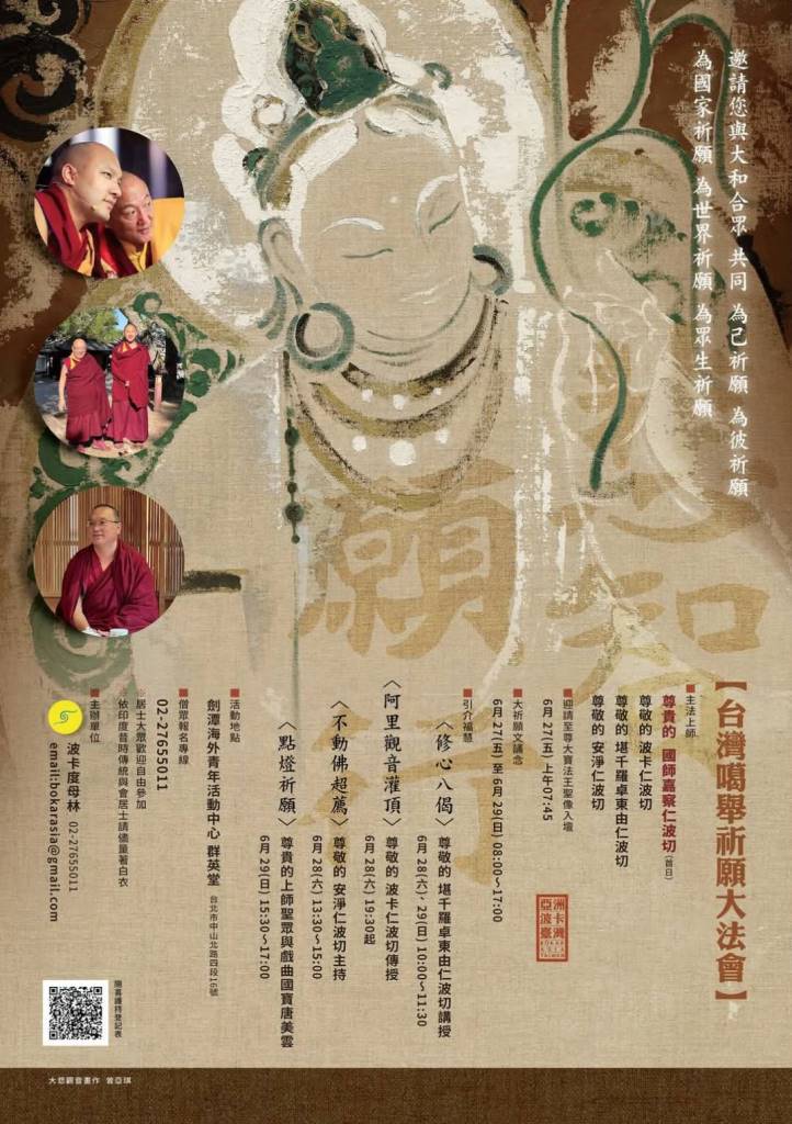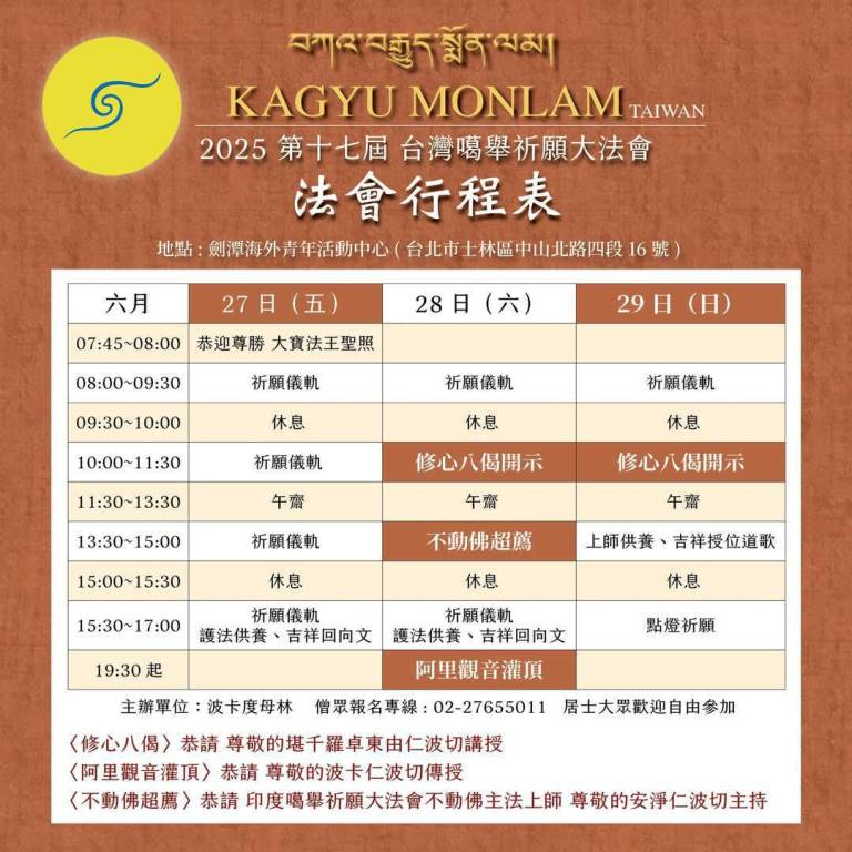 2025台灣噶舉祈願大法會 主法上師:尊貴堪千羅卓東由仁波切、波卡仁波切、安淨仁波切 噶舉 法會 2025/06/27~2025/06/29 2025灣噶舉祈願大法會 邀請您與大和合眾共同 為己祈願、為彼祈願、為國家祈願、為世界祈願、為眾生祈願 ■主法上師: 尊敬的 堪千羅卓東由仁波切 尊敬的 波卡仁波切 尊敬的 安淨仁波切 ■法會內容: 阿里觀音灌頂與祈福超薦修法 ■教學主題: 修心八偈 ■時間: 2025年6月27日(五) 至 6月29日(日) 08:00-17:00 ■活動地點: 劍潭海外青年活動中心 台北市中山北路四段16號 ■主辦單位: 波卡度母林 ■報名電話: 02-27655011 友善列印 上一篇:「見鬘—九乘次第之見、修、果導引」 下一篇:2025佐欽【文武百尊超度煙供大法會】 精選法訊 2026大藏經25套念誦共修活動 2025/11/05~2026/02/25 薩迦 法會 11/7-11/9頂髻尊勝佛母千供延壽 2025/11/07~2025/11/09 噶舉 法會 祭龍食子&龍煙供法會 2025/11/07 格魯 法會 11/7龍王日~龍供-祭龍食子暨百食子供 2025/11/07~2025/11/30 格魯 法會 秘密主金剛手&財寶天王會供賜資糧祈福大法 2025/11/07 寧瑪 法會 2025年蓮師滿願塔‧博達佛塔─盛大供燈 2025/11/08~2025/11/11 薩迦 共修 上師與觀音無別瑜伽 課程及閉關 2025/11/08~2025/11/23 格魯 閉關 2025年11月熹嘉仁波台灣弘法 2025/11/08~2025/11/23 格魯 法會 喇嘛網| Facebook 全球慈悲智慧數位佛學院 全球藏傳佛教最新弘法訊息﹝ Google全球第一資訊同步 ﹞